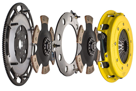 T1R-F02 twin disc kit offers twice the number of disc surfaces for better wear, heat capacity and long life compared to single disc kits. These kits use a proprietary Positive Lift Floater System design, which results in quiet operation with no floater rattle and no posts to wear. ACT twin disc kits endure an exclusive four-stage, heat treating process performed on all diaphragms. The ACT twin disc features the ability to adjust for disc wear and provides equal disengagement for discs. ACT's 6-pad rigid race discs are made with high quality, ceramic friction materials. The chrome-moly hub is heat-treated for strength and durability. The lightweight, rigid design allows for quicker shifts and trouble-free service. All ACT twin disc kits include a CNC-machined and dynamically balanced flywheel to ensure trouble-free installation and operation. ACT twin disc kits include a pressure plate, two discs, a floater, flywheel and alignment tool. Some kits may include a pilot bearing and release bearing.