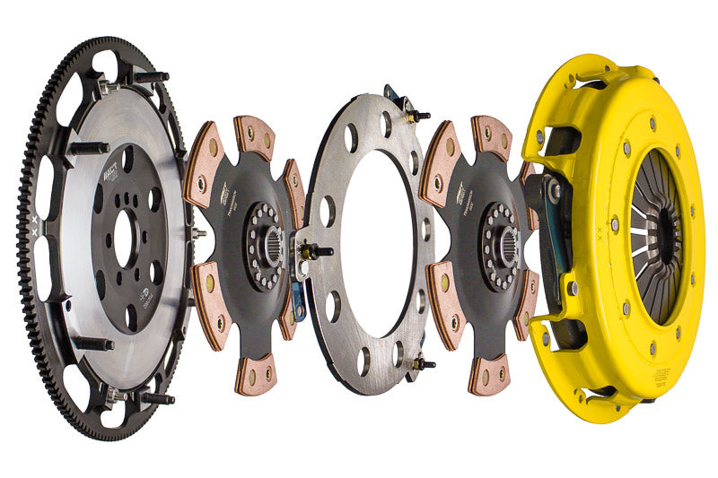 T1R-G02 twin disc kit offers twice the number of disc surfaces for better wear, heat capacity and long life compared to single disc kits. These kits use a proprietary Positive Lift Floater System design, which results in quiet operation with no floater rattle and no posts to wear. ACT twin disc kits endure an exclusive four-stage, heat treating process performed on all diaphragms. The ACT twin disc features the ability to adjust for disc wear and provides equal disengagement for discs. ACT's 6-pad rigid race discs are made with high quality, ceramic friction materials. The chrome-moly hub is heat-treated for strength and durability. The lightweight, rigid design allows for quicker shifts and trouble-free service. All ACT twin disc kits include a CNC-machined and dynamically balanced flywheel to ensure trouble-free installation and operation. ACT twin disc kits include a pressure plate, two discs, a floater, flywheel and alignment tool. Some kits may include a pilot bearing and release bearing.