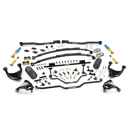 Hotchkis Sport Suspension 80035-2 Stage 2 TVS Kit Extreme with 3 in. drop for 1967-1969 Camaro and Firebird Coupes with Small Block motors. Includes Adjustable Rear Sway Bars 1 1/8 in. Front and 7/8 in. in rear with Chassis Max Sway Bar Brace 3 in. Lowered Sport Springs 3 in. Lowered Leaf Springs and Front and Rear Hotchkis Tuned/Bilstein Shocks Sub Frame Connectors (Chassis Max Brace Also Included on Convertible Kits) all necessary Hardware and Bushings with Heavy Duty Tie Rod Sleeves also included. One Convenient Kit for the ultimate handling GM F-Body Camaro or Firebird nothing beats the Hotchkis Sport Suspension Stage 2 Total Vehicle System. This kit has been rigorously designed and tested on the track yet is very comfortable for your local cruise in. Every aspect of the suspension has been re engineered for the maximum performance and is being offered in a complete tuned package. In front we start out with Tubular Upper and Lower Control Arms which increase caster and improves the camber curve creating more front end grip and traction. Heavy duty tie rod sleeves hold the alignment while 3 in. lowered sport springs and Hotchkis Tuned/Bilstein shocks improve vehicle control and stance. A massive 1 1/8 in. front sway bar and 7/8 in. adjustable rear sway bar reduce body roll and improve handling. To improve traction and reduce wheel hop the rear gets a 3 in.multi leaf drop spring which features a Hotchkis exclusive design that utilizes an overload spring to reduce axle wrap up. The kit comes complete with heavy duty shackles u-bolts pads and all necessary hardware. To stiffen the chassis Hotchkis includes sub frame connectors and a rear sway bar cross member creating a complete package. This system is a proven autocross winner and designed for maximum performance improvement in a installer friendly kit. PROUDLY MADE IN THE USA