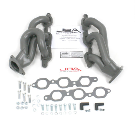 JBA shorty headers are one of the foremost performance upgrades you can bestow upon your beloved car, truck, or SUV. JBA Headers are significantly less restrictive than stock manifolds and dramatically increase the power and efficiency of your engine. Each header is constructed from durable stainless steel to endure the abuse of racing, towing, and daily driving – built to withstand it all. JBA’s proprietary Firecone collector design uses race proven technology for producing maximum power and torque gains where you drive most. Each system includes factory style emission connections and high-quality hardware for a professional no-leak installation.