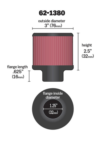 K&N crankcase vent filters are perfect for racing applications, vintage cars or individuals who want to add some aesthetics to their classic carbureted engine. The 62-1380 crankcase vent filter has a black rubber top and base. The filter is 2-1/2 inches tall, 3 inches in outside diameter with a 1-1/4 inch inside diameter flange which is designed to clamp onto a vent tube or outlet. Constructed with a cotton filter media it can be cleaned and reused repeatedly. A 14.79 milliliter pillow-pack of air filter oil included. Note: Legal in California only for racing vehicles which may never be used, registered, or licensed for use upon a highway. See knfilters.com for CARB status on each part for a specific vehicle.