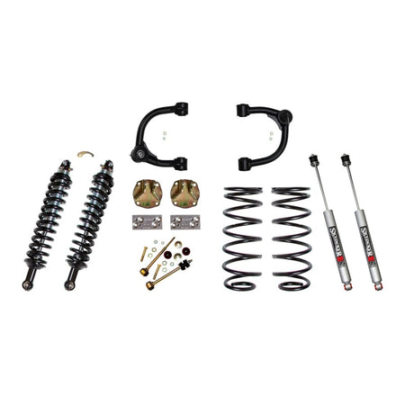 2007-2014 Toyota FJ Cruiser 4WD/2WD 3 in. Upper A-Arm with Heavy Duty Greasable Ball Joints and OEM Style Rubber Bushings to provide a long lasting maintainable A-Arm that Corrects Ball Joint Angle. Front Adjustable High Performance Coilovers, 2.5 in. Rear Coil Springs, Differential Drop to correct CV Shaft Angles, Rear Sway Bar End Links & Rear M95 Monotube Shocks. Do Not adjust models with manual hubs to more than 2 inches of lift over factory height.