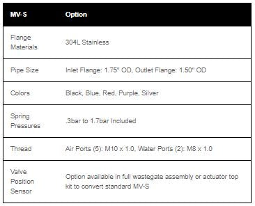 The MV-S 38mm unit is much more compact than its F38 predecessor - standing only 3.7” in height. The V-Band flanges make installation pain free, the three lower & two upper air ports make connecting pressure sources and boost controllers easy!